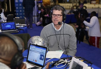 In addition to being seemingly everywhere—WWE matches, golf tournaments, spring training games—while still remaining focused on the Wolverines' offseason workouts, Harbaugh maintains a constant presence online. His tweets include all the usual stuff you'd expect from a coach, including GPA updates and the welcoming of new recruits, as well as fun updates of his overseas trips or his obsession with Judge Judy, but those serve as the complimentary breadsticks before the real meal is served.