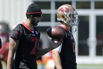 Kaepernick was supposed to be full-go by this point in the offseason. Just what is sidelining him—one of the three injuries, some combination of all of them, a mutual decision by Kaepernick and the 49ers to seek trade partners instead of going through this "competition" charade—has not been revealed.
