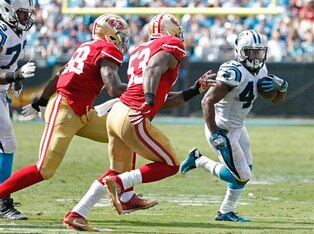 The 49ers' smash-mouth running game was non-existent. Neither RB Carlos Hyde nor backup RB Shaun Draughn were able to generate any type of running presence against DT Star Lotulelei and DT Kawaan Short. As a result, the offense quickly became one-dimensional and would prove to be a huge key in the Panthers win.