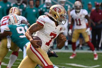 Colin Kaepernick (pictured) has become a dispensary of fantasy-football goodness: He racked up 296 passing yards, three passing touchdowns and 113 rushing yards in a 31-24 loss to the Dolphins. Whether Kaepernick is actually playing "well" is a matter of how closely you watch and how low your standards are. He has looked just effective enough (often while trailing in the fourth quarter, when defenses are softer) to earn a two-year, eight-figure, "prove it" contract in the offseason from some team with dubious quarterback tastes and low standards. Brace yourselves, Jets fans.
