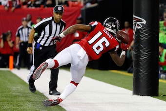 Tevin Coleman catches a touchdown pass. Mohamed Sanu catches a touchdown pass. Justin Hardy, one of the Falcons' weekly random contributors, makes a one-handed, back-of-the-end-zone touchdown catch (pictured) that looks like something Odell Beckham Jr. would do with a butterfly net.