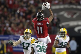 Julio Jones caught nine passes for 180 yards and two touchdowns in the Falcons' 44-21 drubbing of the Packers. The highlights included a 73-yard catch-and-run that started with Jones coming free despite flagrant holding by defensive back LaDarius Gunter and continued with a devastating stiff arm of Damarious Randall.