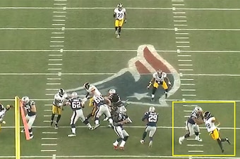 Here, Cannon is facing Steelers outside linebacker Bud Dupree (48)—not a pass-rusher at the Von Miller level, but a good player who had five sacks and 20 stops this season. First, watch how well Cannon turns his body to face Dupree: From the snap through the throw, he's in an optimal position to mirror Dupree, and he has the agility to do so.