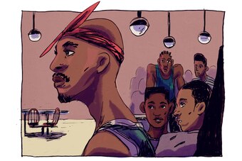 According to Rideaux, Tupac looked over the Long Beach Poly group, noted the collective youth and seemed to calm down. Around this point Knight had returned from inside the In-N-Out, and the players were equally shocked to be in his presence. “It was crazy,” Lewis says. “Not your ordinary rest stop break.” Tupac realized the teenage boys did not pose a threat.