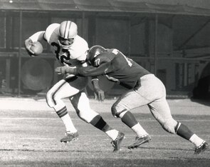 Kelly (shown above), an eighth-round pick from tiny Morgan State, was everything you could want in a running back wrapped in a compact 203-pound package. He started his career as a tackle-breaking return man trapped behind Brown and Ernie Green in the backfield. When Brown retired, immediately proved to be a worthy successor, leading the league in rushing twice and rushing touchdowns three times. His careening rushing style, with lots of start-stop cuts, made him the Le'Veon Bell of his day.