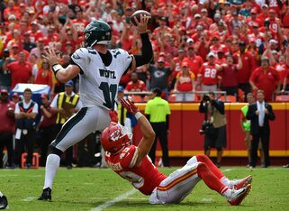 He did rack up 333 passing yards, but the fact they had to throw the ball almost exclusively is especially worrying considering they weren't exactly playing from behind all game. And it's not like Wentz simply got to drop back and pick apart the Chiefs; they consistently pressured the pocket, sacking him six times.