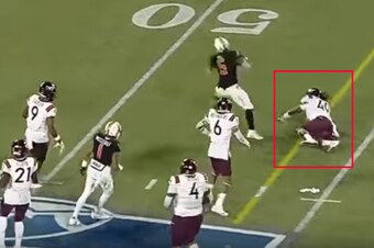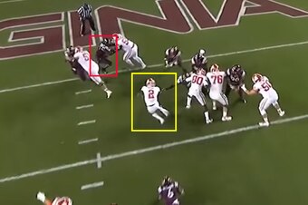 Because Edmunds is so athletic, it's easy for him to track Ellis and match him step-for-step as quarterback Kurt Benkert (No. 6) overthrows his target. Edmunds didn't cover a lot in college, but he clearly has the nascent ability to run with just about any running back or tight end.