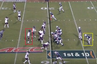 Here, he moves from shallow linebacker depth and takes tight end Richard Burney (No. 16) around the edge, where Edmunds nearly gets to Benkert before the quarterback hands off to receiver Joe Reed (No. 2).