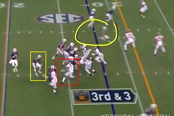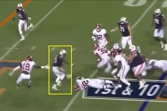 As Harrison hits the ground, the block allows quarterback Jarrett Stidham (No. 8) to step up in the pocket and make the throw to receiver Will Hastings (No. 33) for a 20-yard completion. This was a 3rd-and-3 play with Alabama up 14-10, and if Harrison doesn't make that block, the landscape of this game could have changed entirely.