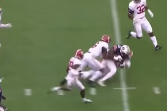 He's caught by three Alabama defenders about 12 yards downfield and uses his power to gain the extra yards on the play.