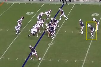 Auburn is lined up in an offset Pistol formation with fullback Chandler Cox (No. 27) as an H-back to the strong side.