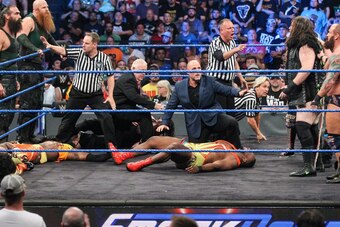 Daniel Bryan, Kane, Big E, Kofi Kingston and Xavier Woods wasted little time setting the tone for the wild and chaotic main event of the show, clearing Eric Young, Alexander Wolfe, Killian Dain, Harper and Rowan from the squared circle ahead of the final commercial break of the evening.