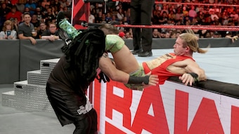 Strowman punished Reigns, but the universal champion fought back and delivered a Samoan Drop off the announce table and to the arena floor.