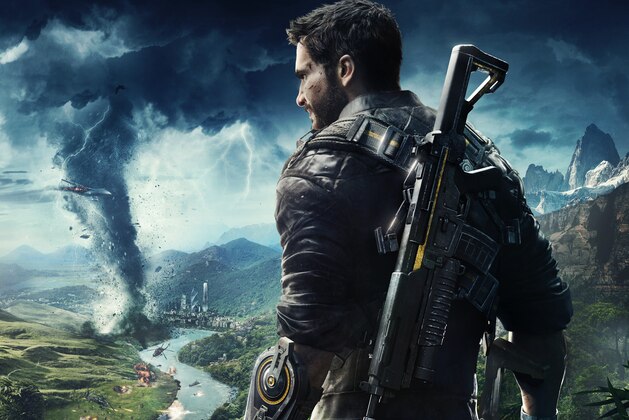 The Just Cause 4 cover depicts hero Rico Rodriguez standing before a swath of chaos featuring helicopters, boats and highlighted by a tornado, which is fitting because the player rips through the game's fictional Solis much like a twister.
