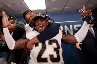 With that, Robey-Coleman jolts to his feet and darts inside to the locker room, where a pack of local reporters are waiting for him to address his fine. As he snakes through the TV cameras, other Rams DBs watch him closely, and Marcus Peters yells from a few lockers away, "Tell them to take it up with your lawyer!" Robey-Coleman is diplomatic. He speaks for about five minutes before heading to his locker and pulling a Money Talks hoodie over his head.