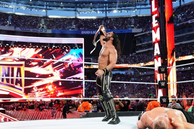 In as epic a tone-setting match as one will see at a WrestleMania, Seth Rollins stripped Brock Lesnar of the universal title quickly after some pre-match shenanigans.