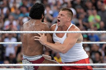 Gronkowski already had a run-in with Jinder Mahal back at WrestleMania 33 in Orlando, Florida. He got involved in some trash talk, Mahal threw a beer on him, so Gronk hopped the barricade and got physical, helping his friend Mojo Rawley win the Andre the Giant Memorial Battle Royal.