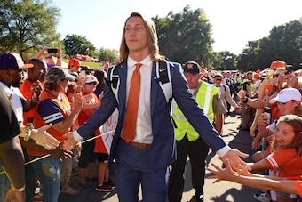 Then in his first game as a starter, Lawrence suffered a head injury, left in the second quarter, and Clemson nearly lost its undefeated season. "He takes a big hit in the first half of his first game without Kelly, and they don't give him his helmet back," says Clemson backup quarterback Chase Brice, who took over and guided the Tigers to a 27-23 win. "It's a cruel irony. I just tried to play like I was coached and keep our season alive. We win, and we're in the locker room and everyone is going crazy. Trevor comes up to me and says: 'Thank you. I'm so happy for you.' He was genuinely excited for me. That's the kind of guy he is."