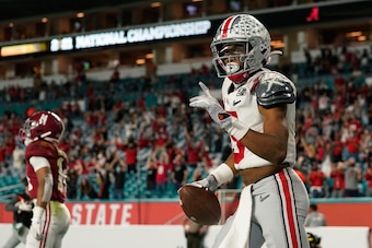 It was that way throughout the game for the nation's best playmaker. He was a walking mismatch in a memorable performance that included a CFP title game-record 12 catches—all coming in the first half—for 215 yards and three touchdowns.