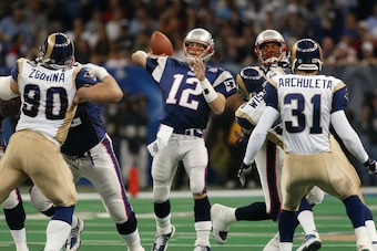 Brady returned to the lineup after exiting the AFC Championship Game win over Pittsburgh, but expectations were low. Vegas viewed the St. Louis Rams and their record-setting "Greatest Show on Turf" offense as a 14-point favorite in Super Bowl XXXVI.