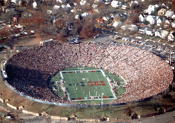 It was the first bowl-shaped stadium in history, and plays host to one of the most storied rivalries in all of collegiate sports. The stadium is also the third biggest in all of Division 1-AA, having a capacity of 61,000. While not enormous compared to the largest of Division 1, it's still impressive given the mere 11,000 student body.
