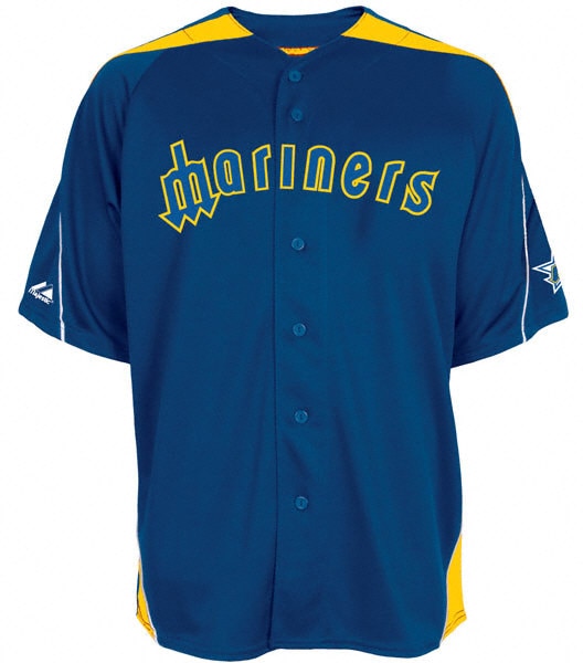 The thing that makes these uniforms, though, is the upside down trident that makes the "M" in Mariners. I think that it is really cool, and it is definitely one of a kind.