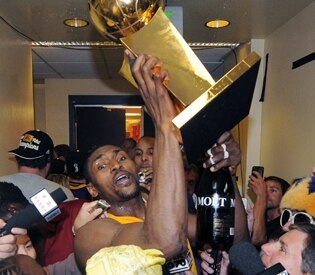 In the finals seconds of Game 5 of the conference finals against Phoenix, he made one of the great “Basketball IQ” plays of recent years. As Kobe attempted a potential game-winner from the right wing, Artest got around Jason Richardson, dove into the lane. As Kobe’s shot fell short, Artest grabbed the air ball and hit an off-balance game-winner at the buzzer. Two nights later in Phoenix, he made 10 of 16 shots (including four 3-pointers) and scored 25 points as the Lakers eliminated the Suns to advance to the Finals.