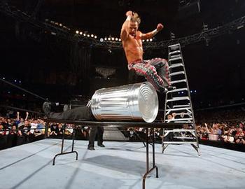 In the most memorable spot in Wrestlemania 22, Shawn Michaels leapt from an enormous ladder and connected with his signature flying elbow drop on Vince McMahon (while wearing a trash can on his head) through a table.