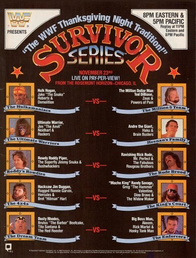 A perfect example is the match on the picture, at Survivor Series 1987, all those teams were in the same match: