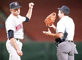 In a game in 1987 against the Angels, Twins knuckleballer Joe Niekro's slider was unhittable. Umpire Tim Tschida came out to the mound to see if there was anything fishy going on. As this happened, an emery board flew out of Niekro's pocket. In addition, he was found to have sandpaper on his finger.