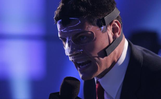 How can you say a man has a severely damaged face only to give him a transparent mask, clearly illustrating that he looks exactly the same!