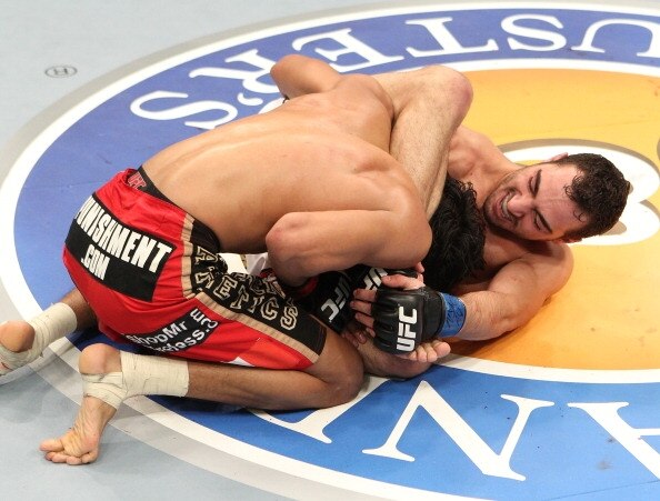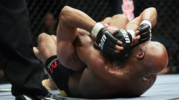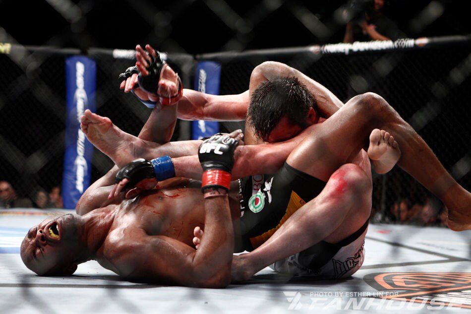After hurting Henderson badly with strikes, Silva smothered the olympic wrestler on the ground.