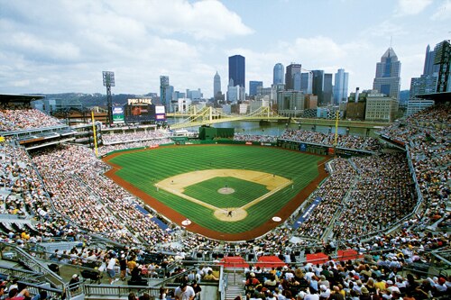 The stadium has a great cityscape look at downtown Pittsburgh, and is located right on the Allegheny River with a view of what is now named Roberto Clemente Bridge.