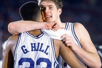 What Hill is best known for is his role in Duke's most dramatic and proudest moment ever. In 1992, with a trip to the Final Four on the line against Kentucky, Duke trailed by one with 2.1 seconds left in overtime and a full court to go. Hill, unguarded under his own basket, baseball-threw the ball to the opposite free throw line, where Laettner caught it, faked right and pulled off a spinning fadeaway jumper for the win.