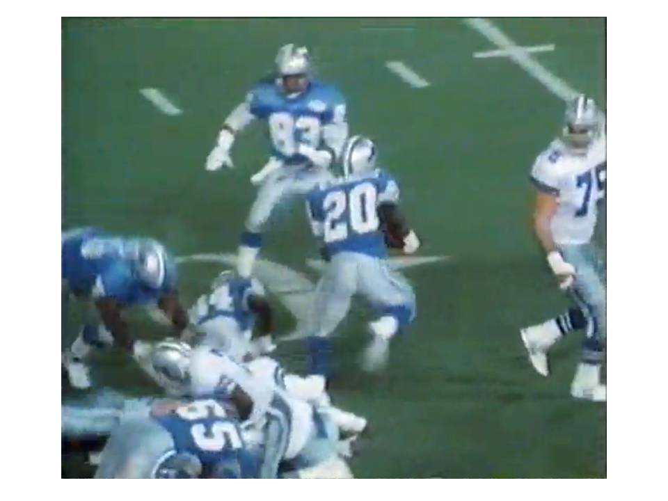 Barry runs for a TD against Dallas in the Lions’ only playoff win since the late 50’s. Barry somehow got lost in the sea of players with some Cowboys thinking he was tackled. He escaped, darted behind DT Tony Casillas, juked LB Ken Norton and sprinted untouched to the end zone.