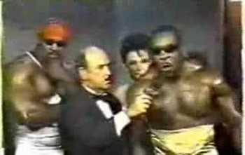 Here's Vader attempting to cut a promo on Kane prior to a pay-per-view match during an interview with Sunny. The promo didn't need any help bombing, as Vader wasn't very convincing of what time it was; however, Road Warrior Hawk inadvertently walked in midway through the interview, causing even more unintentional comedy.
