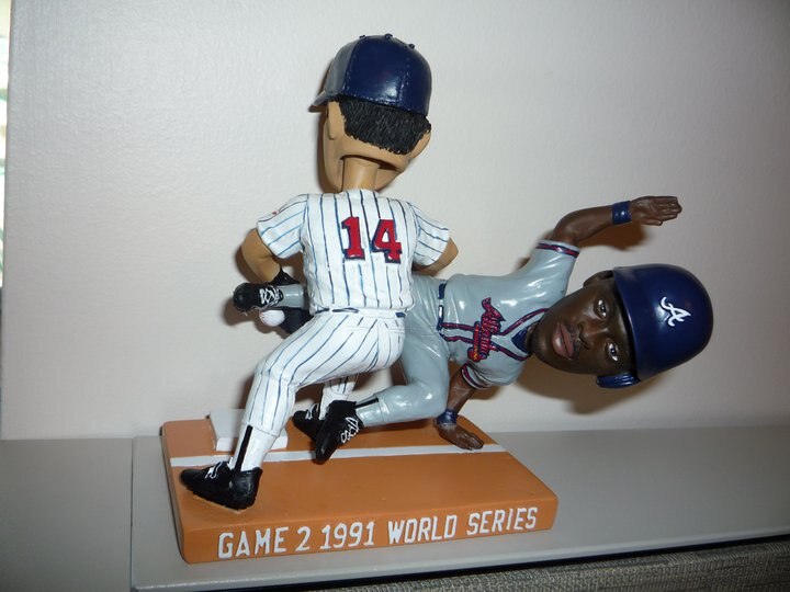 OK, so this is one of the most amazing bobbleheads of all time, memoralizing the moment in Game 2 of the 1991 World Series when Kent Hrbek wrestled Ron Gant off of first base in full view of the first-base umpire, who flat out missed it.