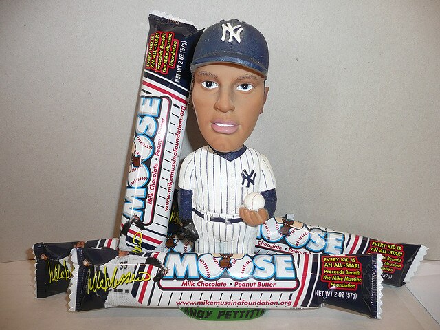 Whoever took this picture posed an Andy Pettitte bobblehead with what appears to be Mike Mussina-themed "Moose" candy bars.