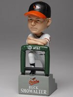 Unfortunately, this is a low-res photo of an Orioles' promotional bobblehead of Buck Showalter that looks exactly like him, in a typical stance that he strikes in the dugout, wearing a grimace he is sure to be wearing all season.