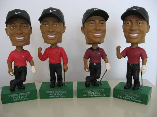 A very nice collection of bobbleheads commemorating the significant moments in Tiger Woods' career.