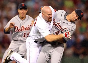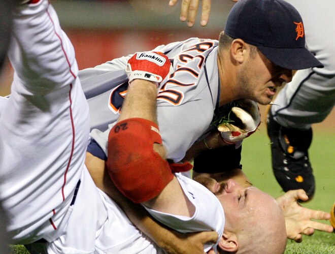 Porcello was slowed down, but only slightly. As Youkilis came into his range, the charging Red Sox slugger, who looked like he had all of the momentum, was greeted with a hip-toss by the 20-year-old rookie, who proceeded to throw him on the ground and body slam him. Way to go, Youk.