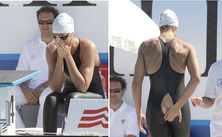 What was really tragic for Zoccari was that she was disqualified from her finals race in the 2009 Mediterranean Games in Pescara, Italy, for this wardrobe rip, which is just ridiculous—she was only trying to add a bit of Flavia to the event.