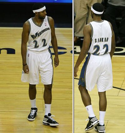 "His number, and last name, were stitched on at the last second by a Wizards employee. And while the stitching held up, it was clear the Wizards employee didn't exactly hold up the number placement to any sort of scrutiny, because the number "22" was a little down, and to the left. And with plenty of spacing between the two "2"s.