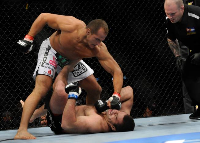 Less then a minute into round one, and Struve was on the floor with the referee looking over him. Dos Santos swarmed on him from the opening bell and didn't let up until the referee jumped in 54 seconds into the first round.