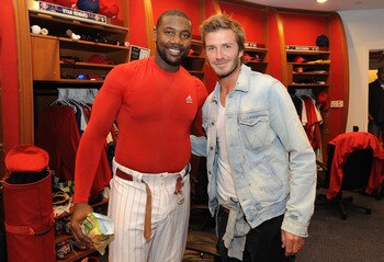 Beckham, seen to the left taking pictures with Ryan Howard, is a good friend of Howard's and follows the team frequently. He appears in the stands whenever he gets the chance, and was present for Roy Halladay's post season no-hitter in 2010, when the Phils' ace stymied the Reds.