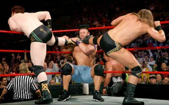 Show does not see Sheamus and McIntyre run up behind him, and they take him out before he even gets in the ring. Barrett, Sheamus, Ryan and McIntyre all stand in the ring, their arms held high in victory.