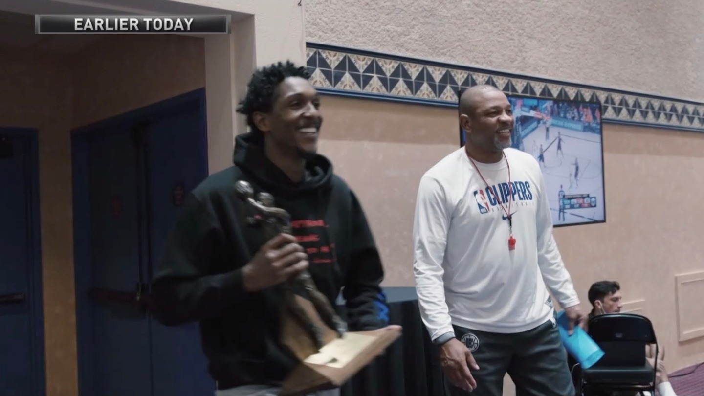 Lou Williams surprises Montrezl Harrell with the Sixth Man trophy during team meeting